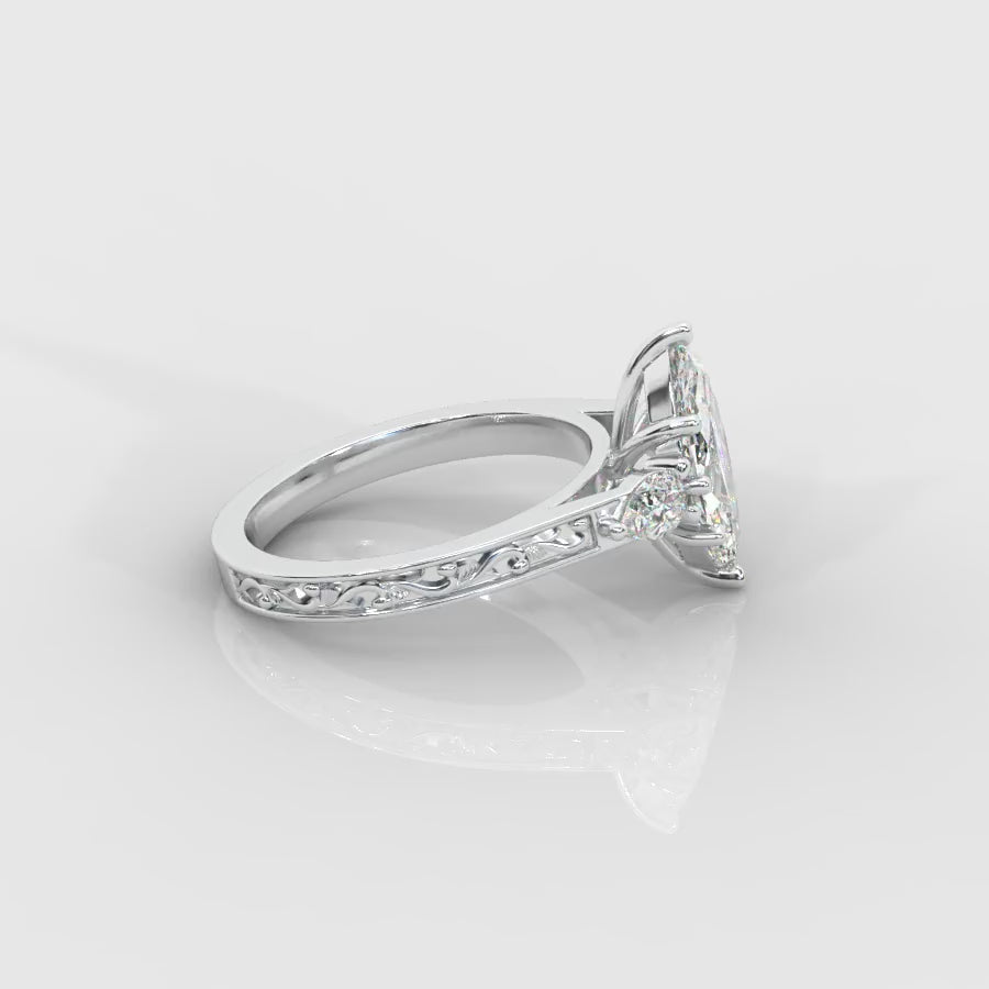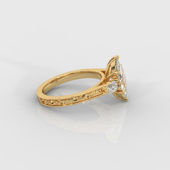 The Caroline ring is a graceful interpretation of the classic three-stone design. Featuring a brilliant marquise-cut lab-grown diamond at its center, it's elegantly framed by two pear-shaped side stones that add balance and softness. The band is adorned with delicate vintage floral detailing, giving the ring a timeless, heirloom feel.