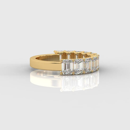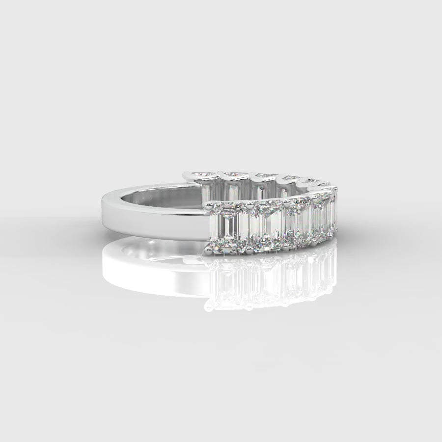 The Casey band features a striking row of emerald-cut lab diamonds set halfway around the band, offering all the sparkle with a touch of practicality. The clean lines and mirror-like facets of the emerald cuts make this design timeless yet modern, perfect for everyday wear or pairing with your engagement ring.