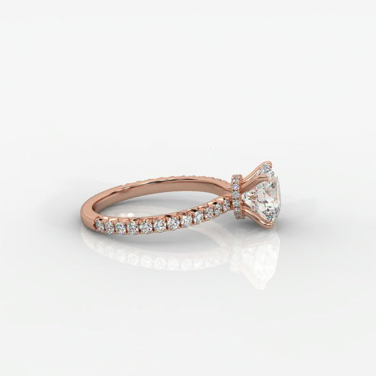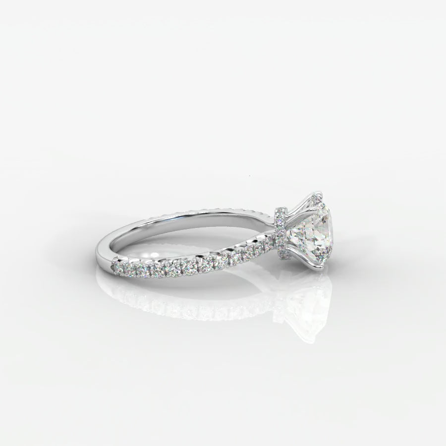 A fine pavé diamond band provides extra shimmer, while the hidden halo beneath the center stone creates a radiant surprise of brilliance from every angle.