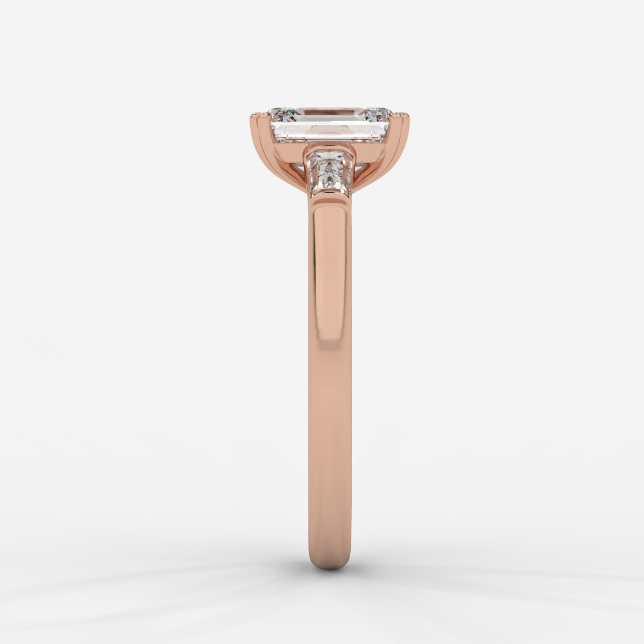 Crafted in 18K yellow, white, or rose gold, the clean lines and geometric precision highlight the emerald cut’s signature hall-of-mirrors effect. We custom cut and hand-select top-quality lab diamonds for every ring, guaranteeing premium E or F color and completely eye-clean VVS clarity.