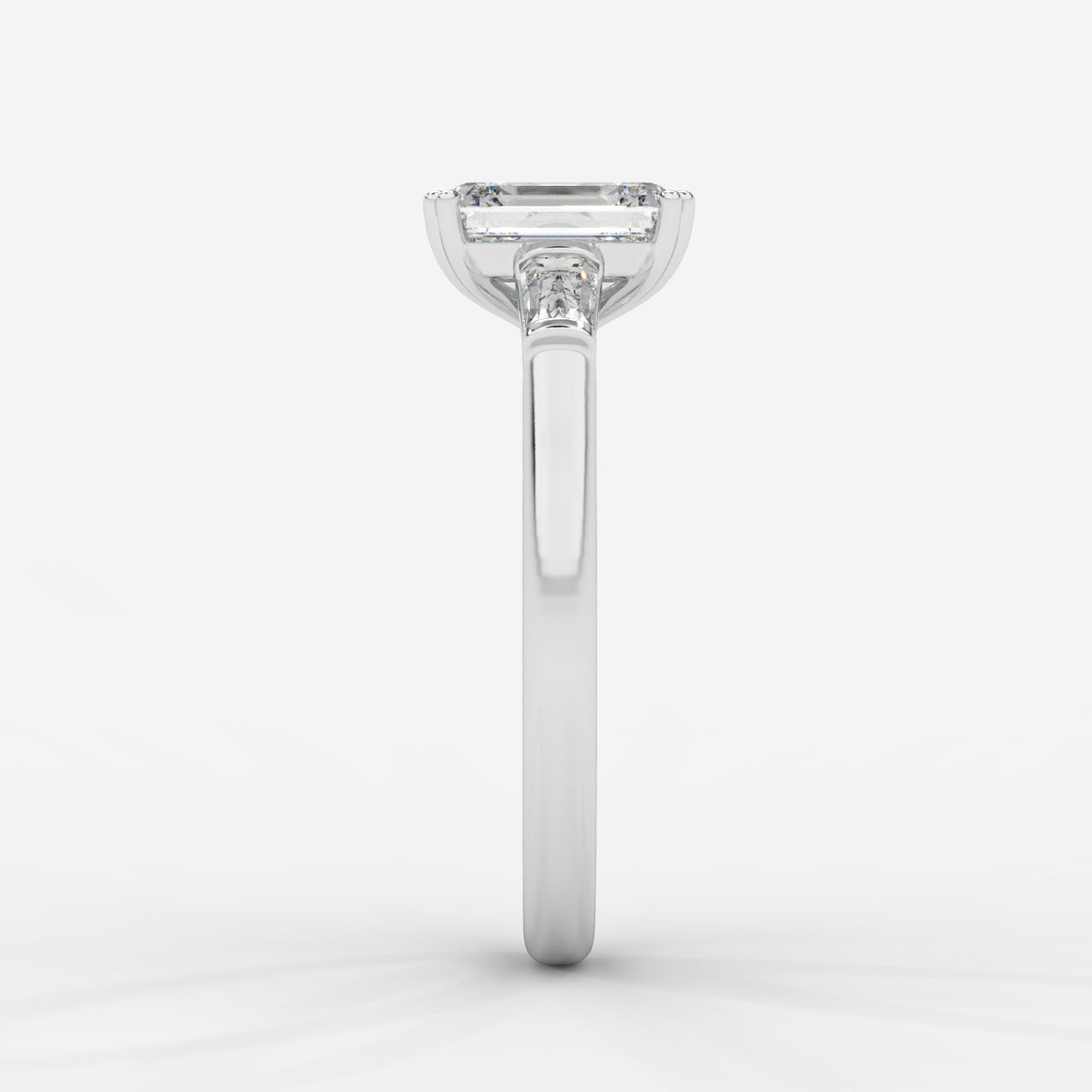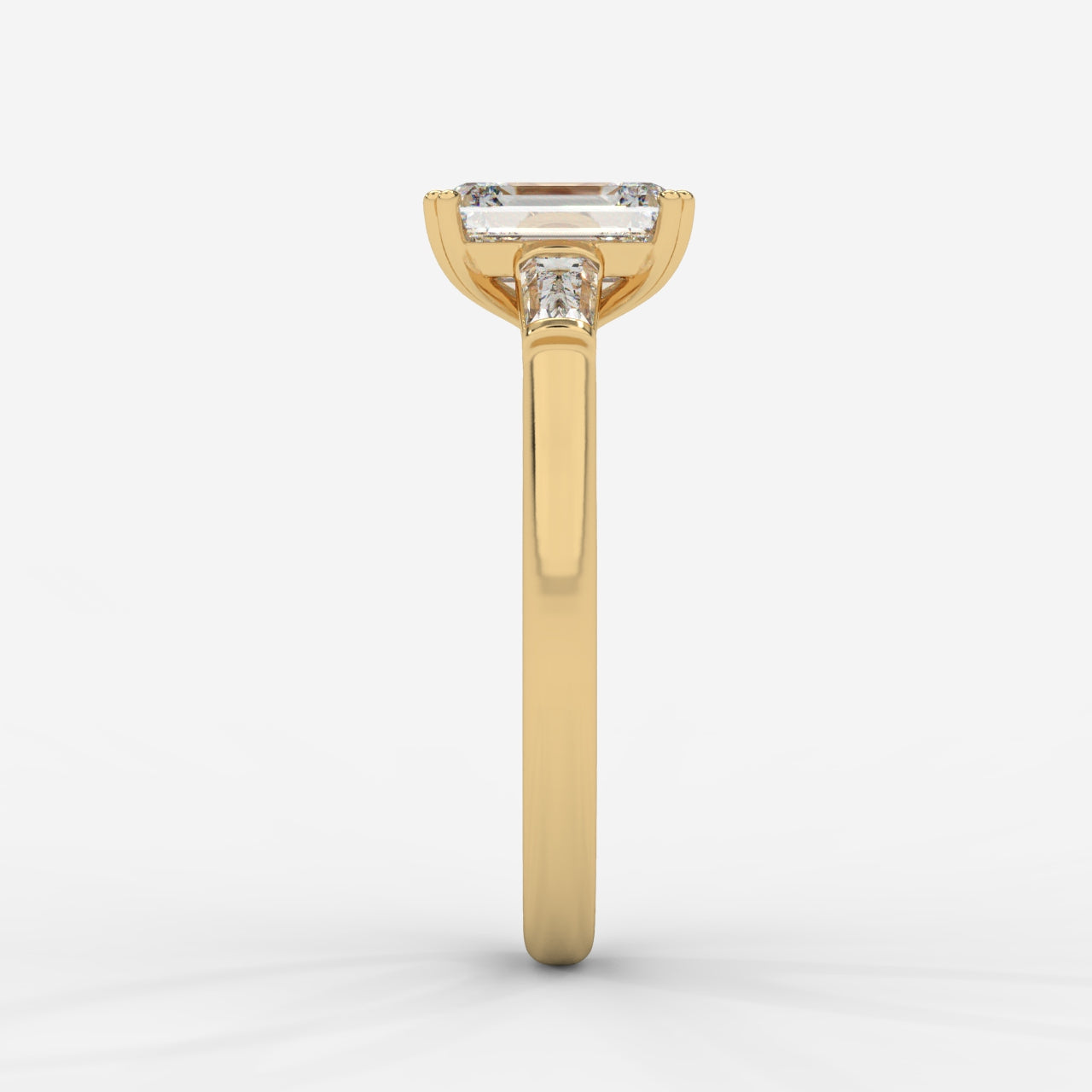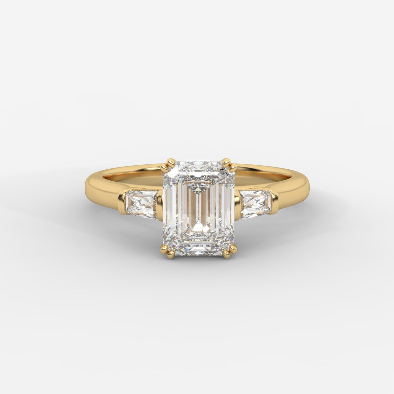 The Helena Emerald Three-Stone Ring is a celebration of timeless elegance. Featuring a striking emerald-cut lab-grown diamond at its center, this design is flanked by two perfectly matched tapered baguette side stones, creating a sleek, balanced silhouette.
