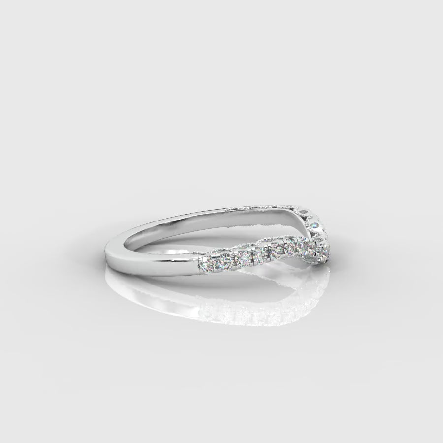 This design features a graceful wave shape with intricate milgrain-style texture along the edges for a subtle vintage touch. Wear it as a wedding band, a curved stacking ring, or as a sparkling accent to your solitaire.